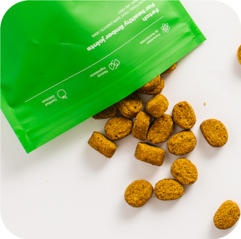 Collagen is a protein that supports the joints, muscles, tendons, ligaments, and cartilage. It also helps their fur, skin and nails stay glossy, healthy and strong.